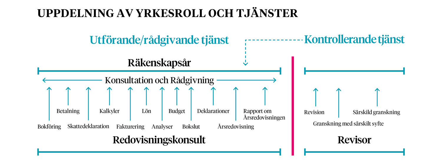 Redovisningskonsult och revisor är två olika yrkesroller som ofta blandas ihop. Många kallar felaktigt båda för ”revisorn”. Yrkesrollerna har dock två helt olika ändamål och arbetsuppgifter. Bilden visar hur arbetet och tjänsterna fördelas mellan dem.